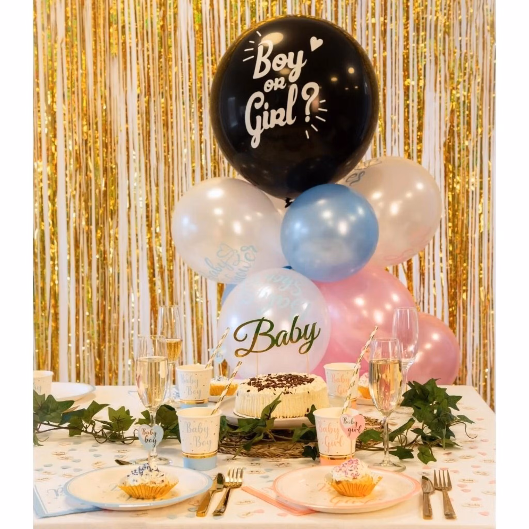 Skapa ett oförglömligt ögonblick på er gender reveal med en stor svart ballong fylld med konfetti. När ballongen spricker avslöjas barnets kön (flicka) på ett magiskt och festligt sätt.