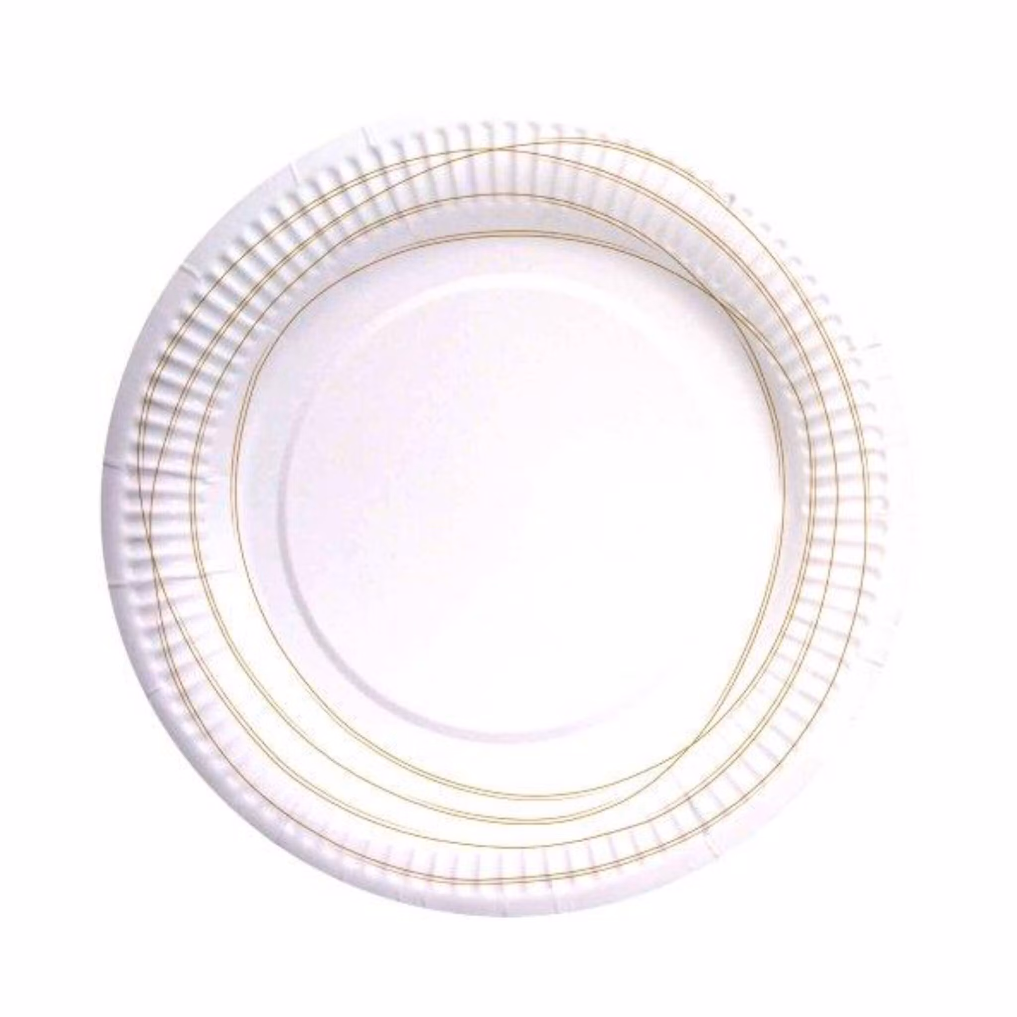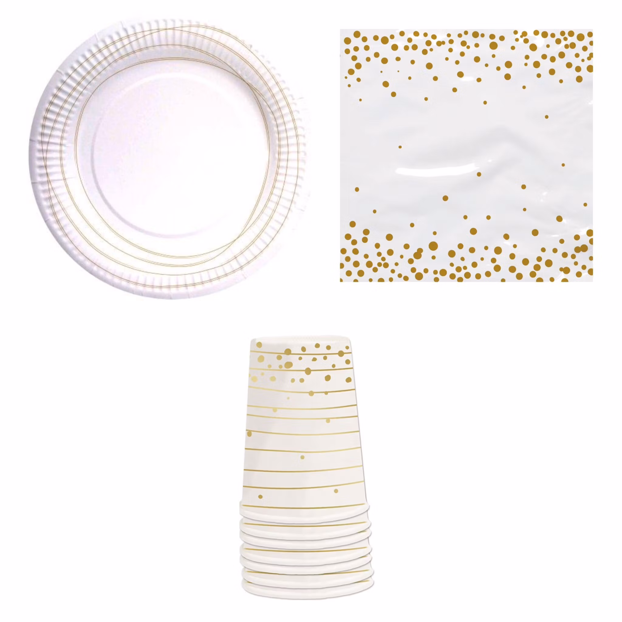 Dukningsset i vit/guld med 6 muggar, 20 servetter & 8 tallrikar. Elegant set till bröllop, dop, nyår & fest.