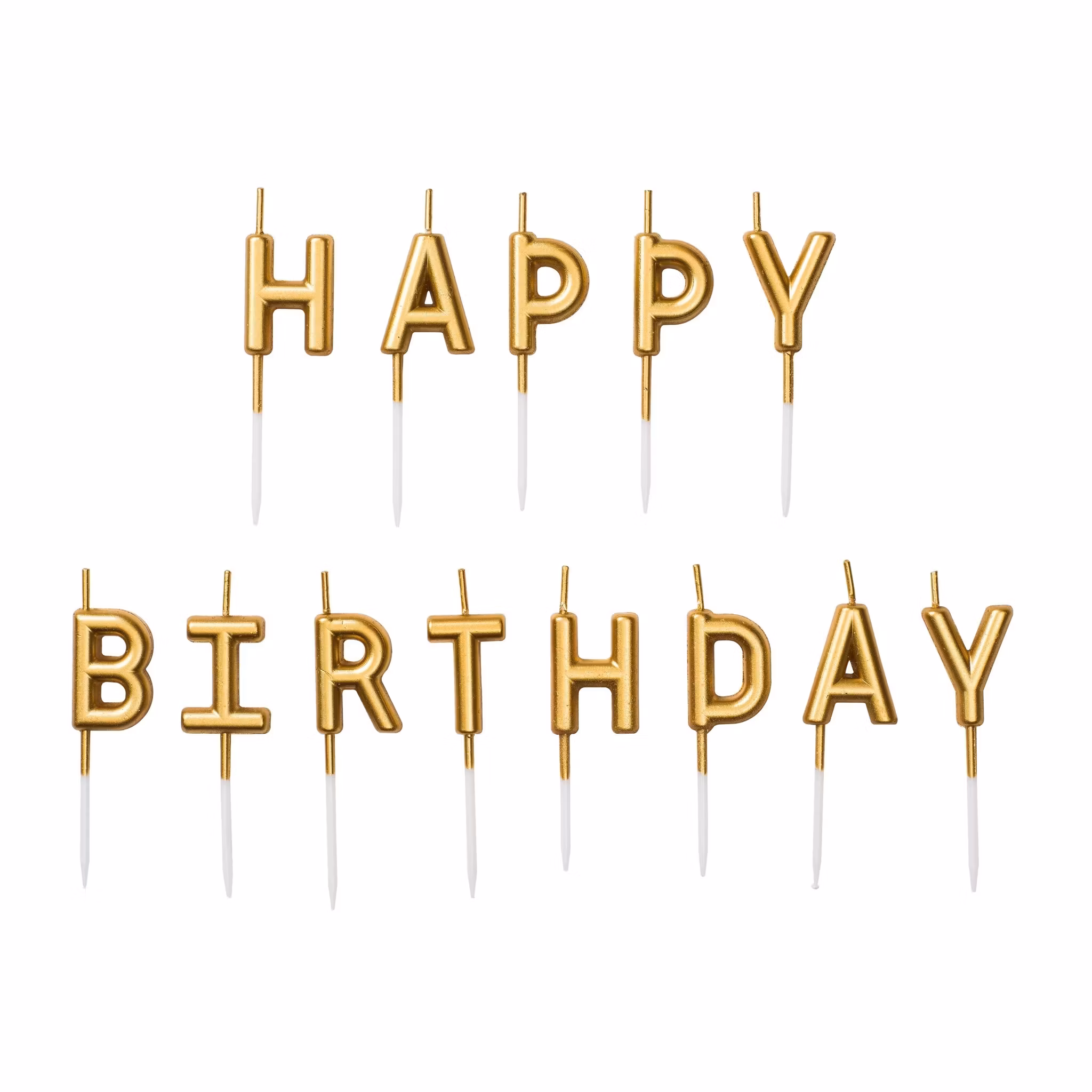 Tårtljus i guld med texten Happy Birthday. Perfekt dekoration till födelsedagstårtan. Ger en elegant och festlig känsla på kalaset.