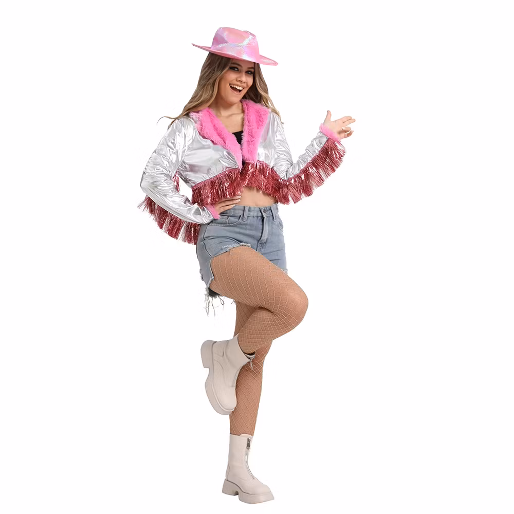 Glittrande Cowboy Disco Lady-dräkt med jacka & hatt. Perfekt till möhippa, födelsedag och party. Haka på disco-cowboytrenden!