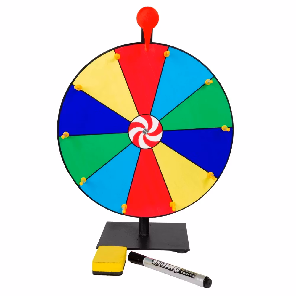 Skriv enkelt dina egna alternativ på hjulet med en whiteboard-penna – drycker, utmaningar, priser eller vad du vill. När du vill ändra texten suddar du bara bort den med ett suddblock. Möjligheterna är oändliga!